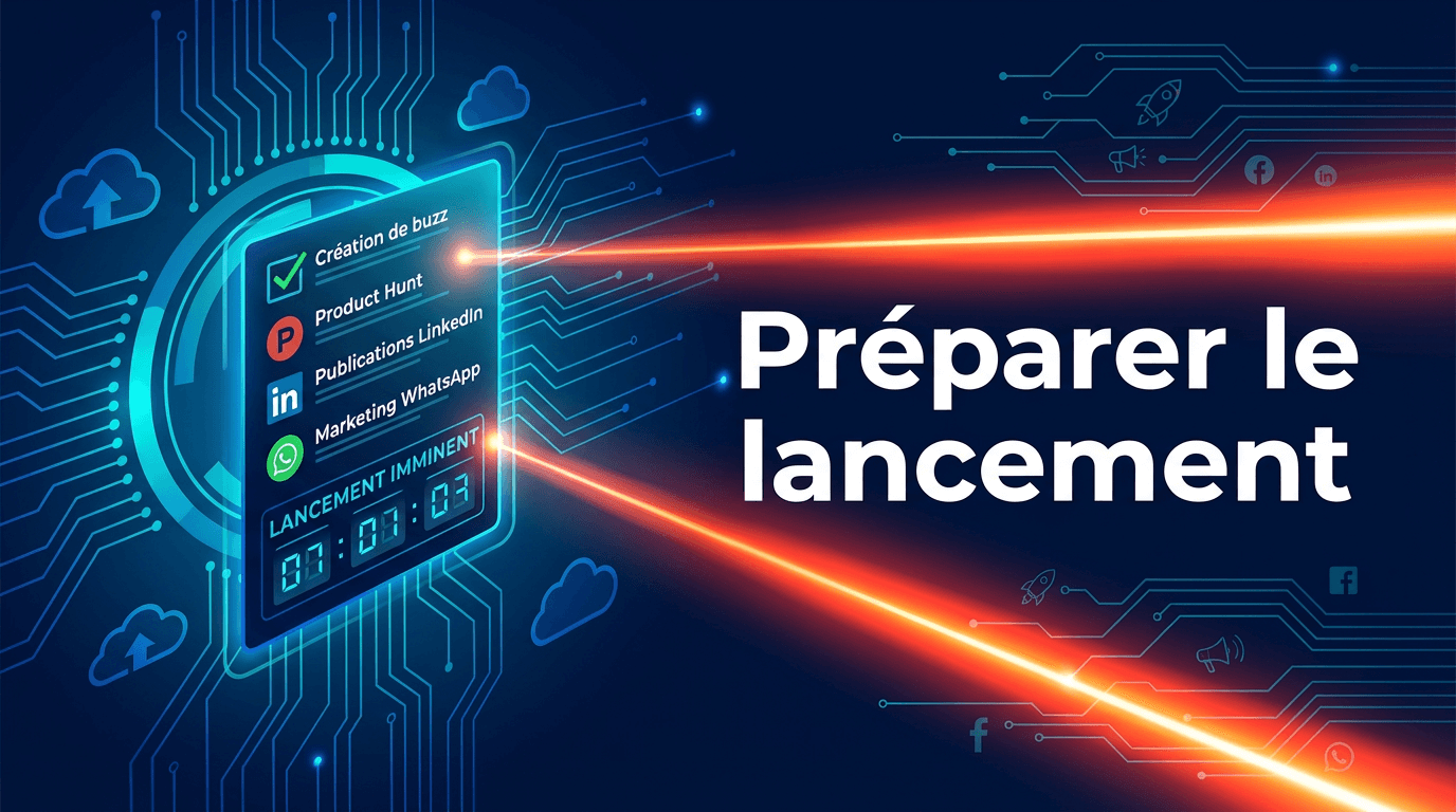 ÉTAPE 22🔒Checklist pré-lancement. Créer le buzz avant le J-Day. Préparer Product Hunt, les posts LinkedIn et WhatsApp. Stratégie 0 → 100 users.